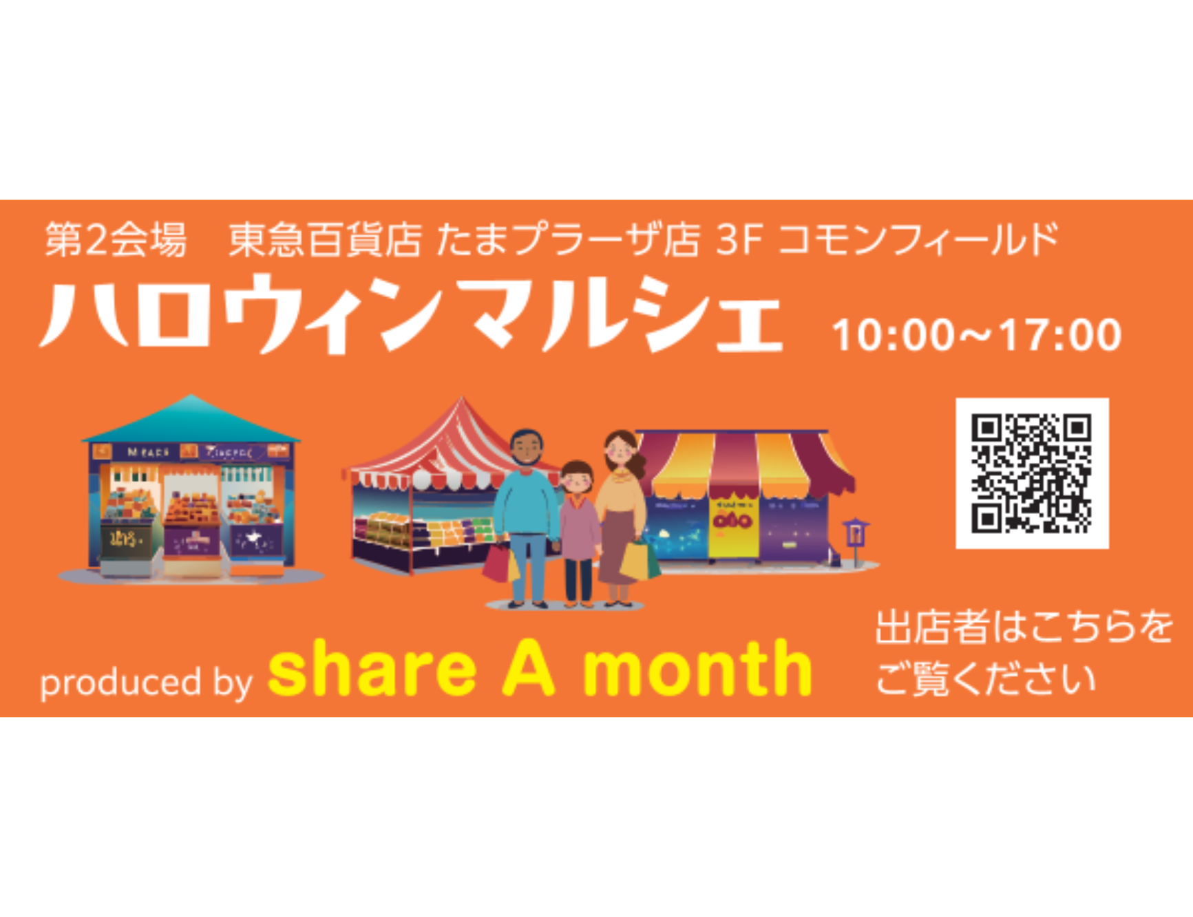 Quest’anno il Tama-Plaza Halloween Festival collaborerà nuovamente con share a month per organizzare uno speciale Mercatino di Halloween! L’evento si terrà al grande magazzino Tokyu, al terzo piano (Common Field), dove troverete tanti prodotti unici a tema Halloween. Scoprite il profilo Instagram per vedere la lista aggiornata dei negozi partecipanti!